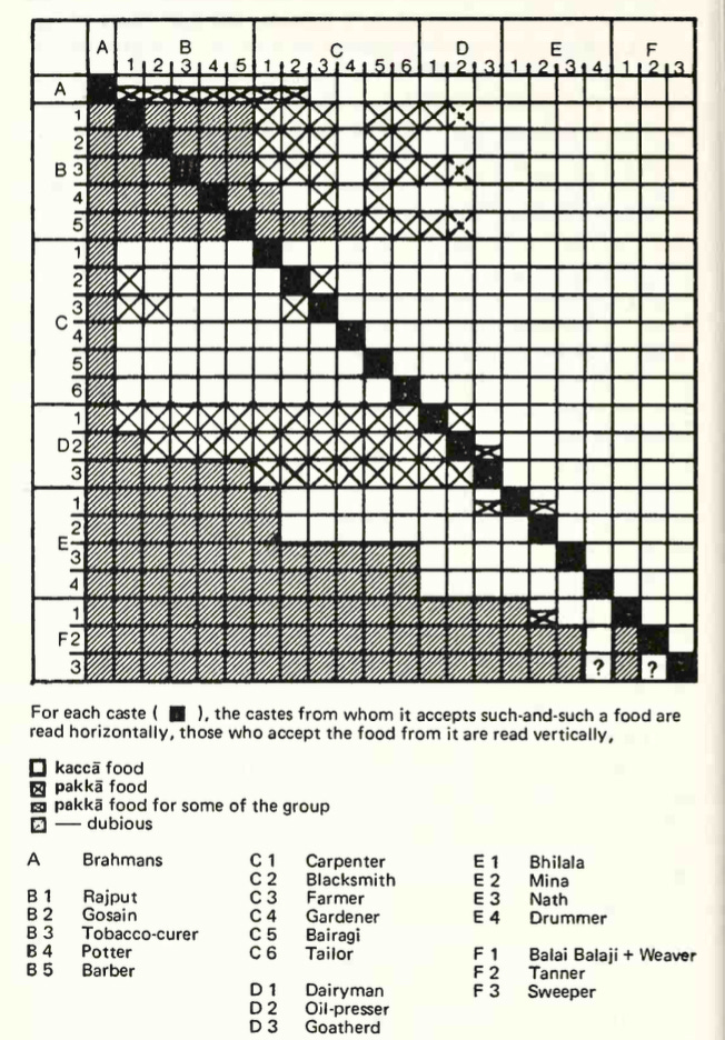 Dumont’s aim is to examine the caste system from the inside: instead of starting with big historical theories, he wants to reconstruct what it’s like to see the world through the eyes of someone deeply embedded in the world of caste. This is a difficult job. Europeans instinctively see society as a collection of basically autonomous individuals who have decided to come together for mutual gain. Indians are simply not the same. For Indians, any individual human being is just a piece of a rigid, all-encompassing hierarchy. And hierarchy is what Dumont identifies as the main principle of the caste system. Hierarchy looks a lot like ordinary power, but Dumont insists it’s something entirely different. There’s a division of labour, but ‘it eludes what we call economics because it is founded on an implicit reference to the whole, which, in its nature, is religious or, if one prefers, a matter of ultimate values.’ Instead, the basis of the hierarchy is purity. Dumont contrasts India with Polynesia, where commoners can’t approach the king because his mana is so powerful it might kill them. In India, meanwhile, the Brahmin is the fragile one. These people really can’t do anything; they’re so pure that even the shadow of a low-caste person can pollute them, at which point they need to take a ritual bath or rub themselves with one of the five products of the cow. But everyone is polluted by the castes beneath them, which is why people refuse to take water or cooked food or to share a pipe with anyone too far below them in the order of purity. (Obviously you can take raw food, otherwise only the farmers would be able to eat.) This is what keeps the whole thing functioning. So in the chart above, the potter caste will accept boiled rice from the carpenter caste, but not the gardener caste. This is how you can tell that carpenters are higher-caste than gardeners. But absolutely nobody will take food from the tanner caste, who work with dead cows and are therefore inherently impure and untouchable. This holds even though most untouchables didn’t actually do the impure work associated with their castes; they were usually just agricultural serfs. The stink of leather still clings to their skin.